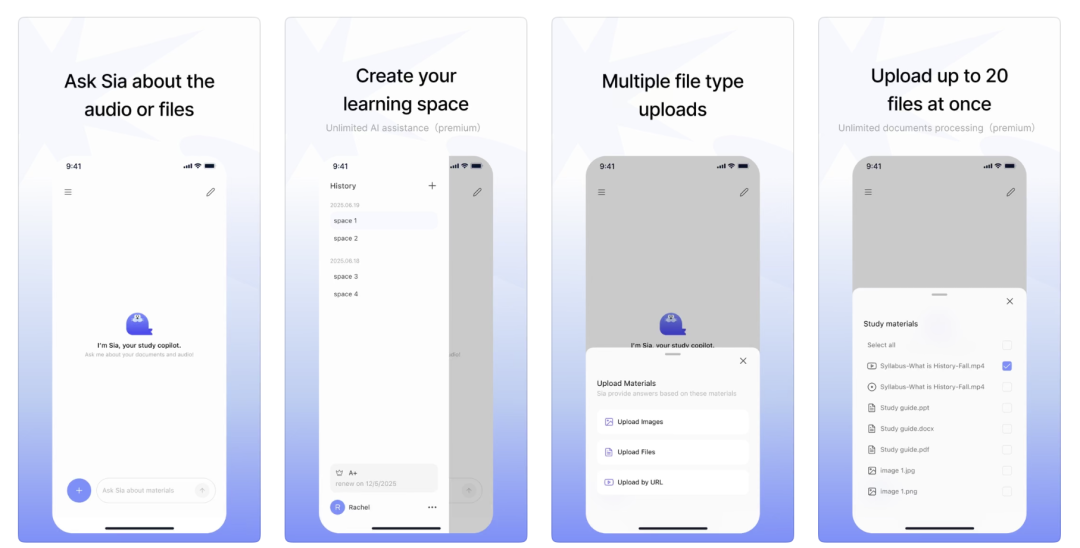 一屏多用:支持录音、文件上传、AI对话以及笔记注释等功能的同屏使用,可一次性上传音频、照片、PDF、PPT、实时录音等超50种媒体文件,按照课堂勾选或全选同时处理各类学习素材。