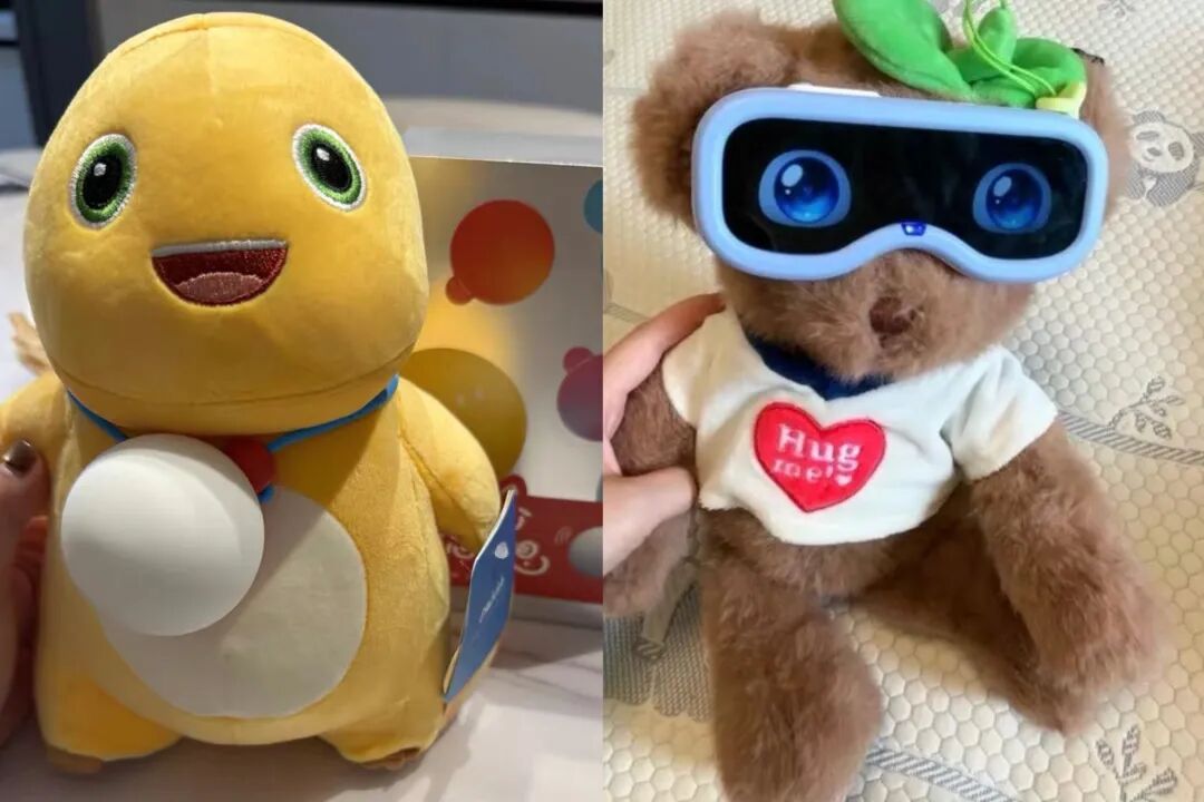 △左为跃然创新BubblePal奶龙AI毛绒玩具,右为可豆AI眼镜+好奇熊AI玩具,两者均可通过AI大模型进行交互