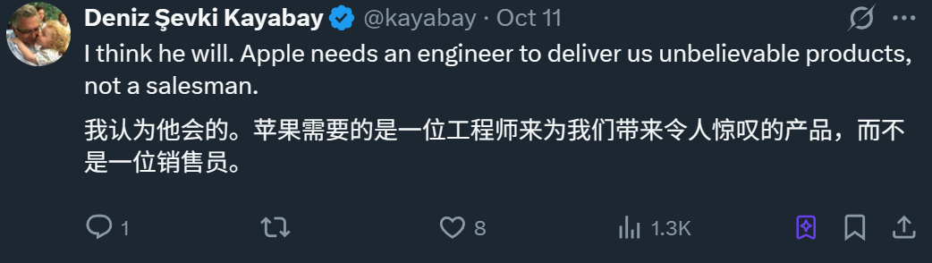 在此背景下,外界普遍认为苹果当前急需一位真正懂技术、懂产品的CEO。