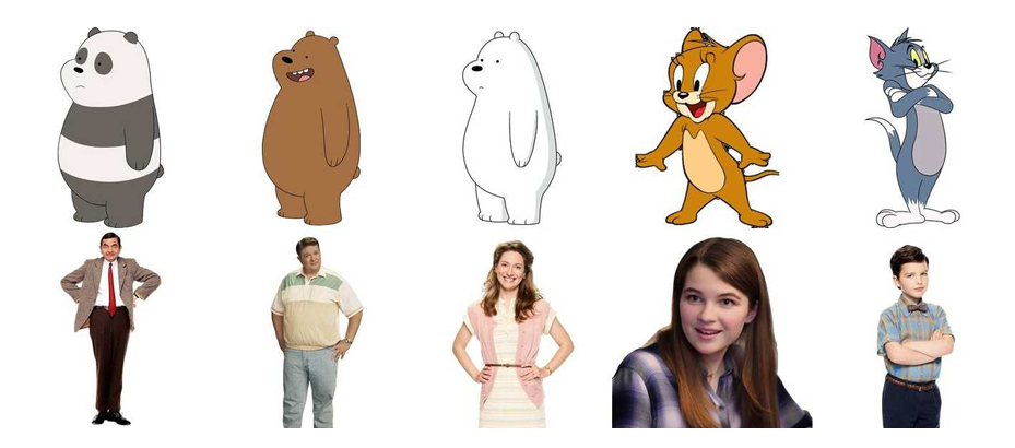在实验中,研究团队选取了10位角色:卡通阵营的Tom、Jerry、Grizzly、Panda、Ice Bear,以及真人阵营的Mr. Bean、Sheldon、Mary、George、Penny。
