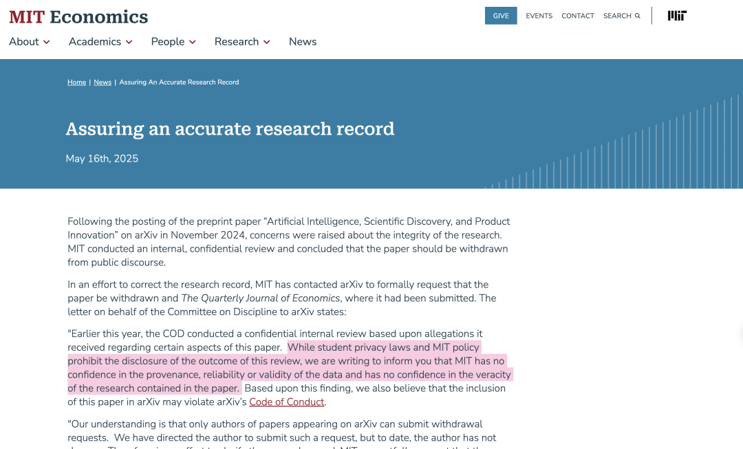 2025 年曝光的 MIT 论文造假事件从侧面反映了这一问题。该论文声称 AI 辅助可使新材料发现量增加 44%、专利申请量提升 39%,一度被奉为 「AI 对科学影响的最佳研究」,甚至被一众科学大佬点赞。但后续调查发现,论文数据存在造假。虽然校方由于隐私未将调查结果披露,但在声明中明确表示「对论文所用数据的来源、可靠性及研究结论的真实性均存疑」。