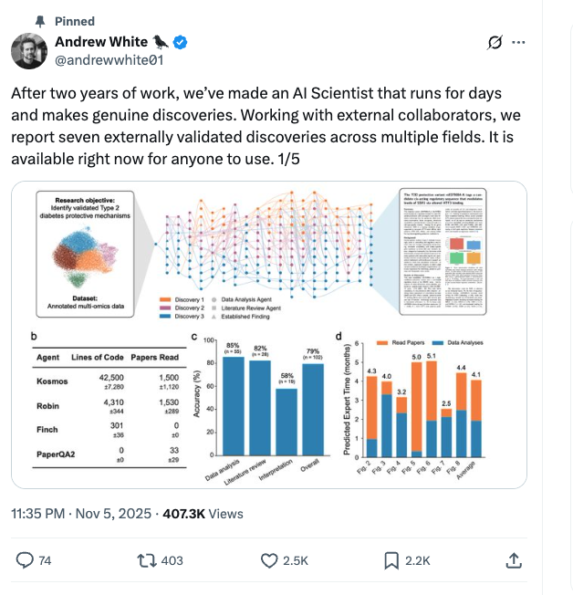 这意味着,AI 科学家不仅能提出研究问题,还能在生命科学这一极度复杂的领域中,完成具有临床潜力的发现。