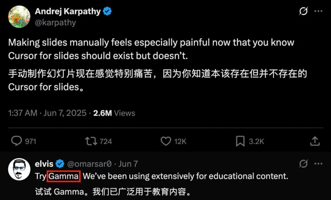 所以当卡帕西发帖求推荐PPT版Cursor时,下面清一色都是网友自发刷屏的:Gamma!