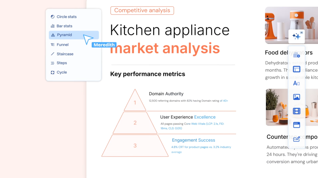 从思路到幻灯片一键生成,无需从头设计,就能制作出品牌风格一致的精美PPT,还能导出格式无缝衔接到PowerPoint、Google Slides。