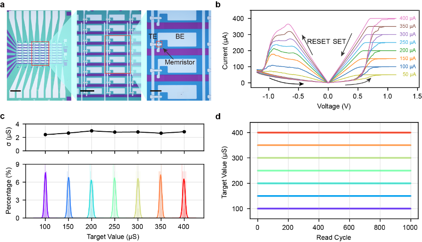 (a) 实际制造的8x8忆阻器阵列显微图像;(b) 器件的多级电导调控(SET/RESET);(c) 阵列上64个器件的编程一致性统计;(d) 多个电导状态的读取稳定性。
