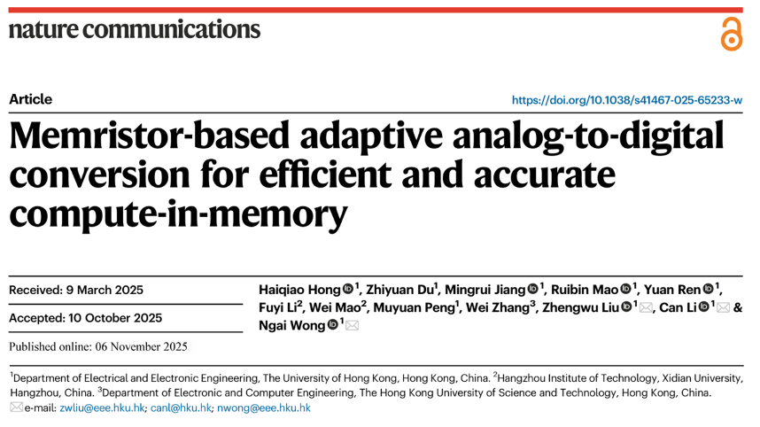 近日,来自香港大学、香港科技大学与西安电子科技大学的由刘正午、张薇、李灿、黄毅领导的联合研究团队正面攻克了这一难题,论文第一作者洪海桥在国际上首次提出了一种基于忆阻器的硬件原生自适应ADC架构。