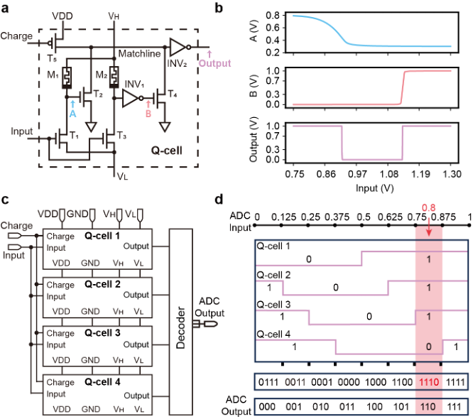 (a) 论文提出的基于忆阻器(M1, M2)的Q-cell核心电路;(c, d) 多个Q-cell和一个解码器(Decoder)共同构成一个完整的ADC。