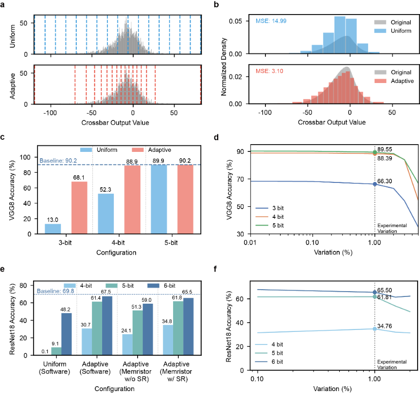 自适应量化与超分辨率策略的性能。(a, b) 自适应量化(红色)相比均匀量化(蓝色)能更好地拟合数据分布,均方误差(MSE)从14.99降至3.10;(c, e) 在VGG8和ResNet18网络上,自适应量化均大幅优于均匀量化;(d, f) 独创的超分辨率(SR)策略成功克服了器件差异带来的精度下降。