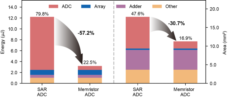 系统级能耗与面积对比。集成忆阻器ADC后,ADC的开销被极大压缩,系统总能耗和总面积显著降低。
