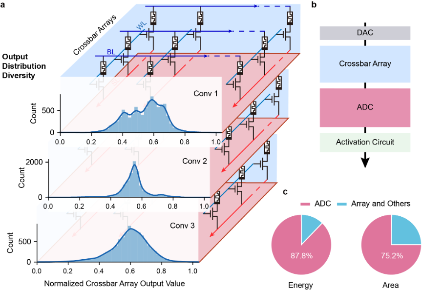 (a) 存算一体阵列中不同层(Conv 1, 2, 3)的数据分布各不相同;(b) CIM系统流程;(c) ADC(粉色)在CIM系统中占据了绝大多数的能耗(87.8%)和面积(75.2%)。