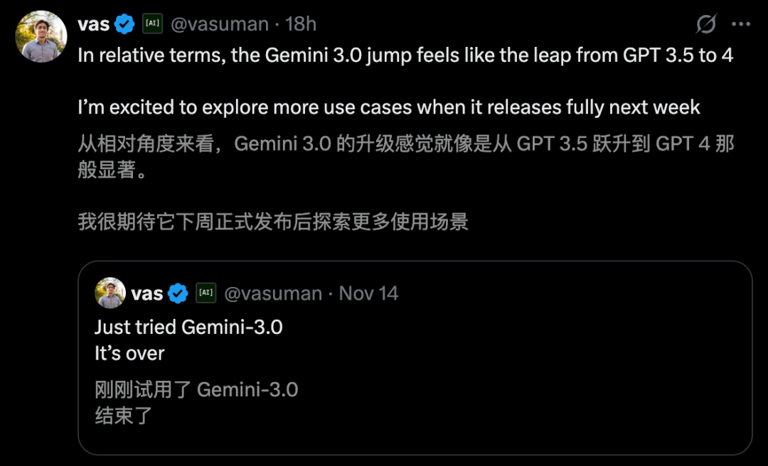 提前上手的AI大牛毫不夸张地称,Gemini 3.0这次飞跃,其相对意义堪比从GPT-3.5到GPT-4的巨大跨越。