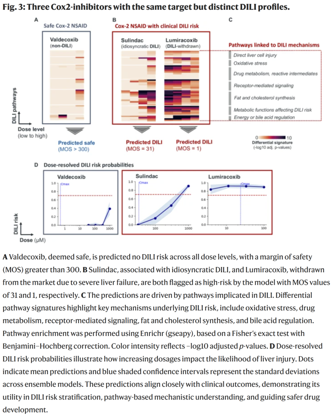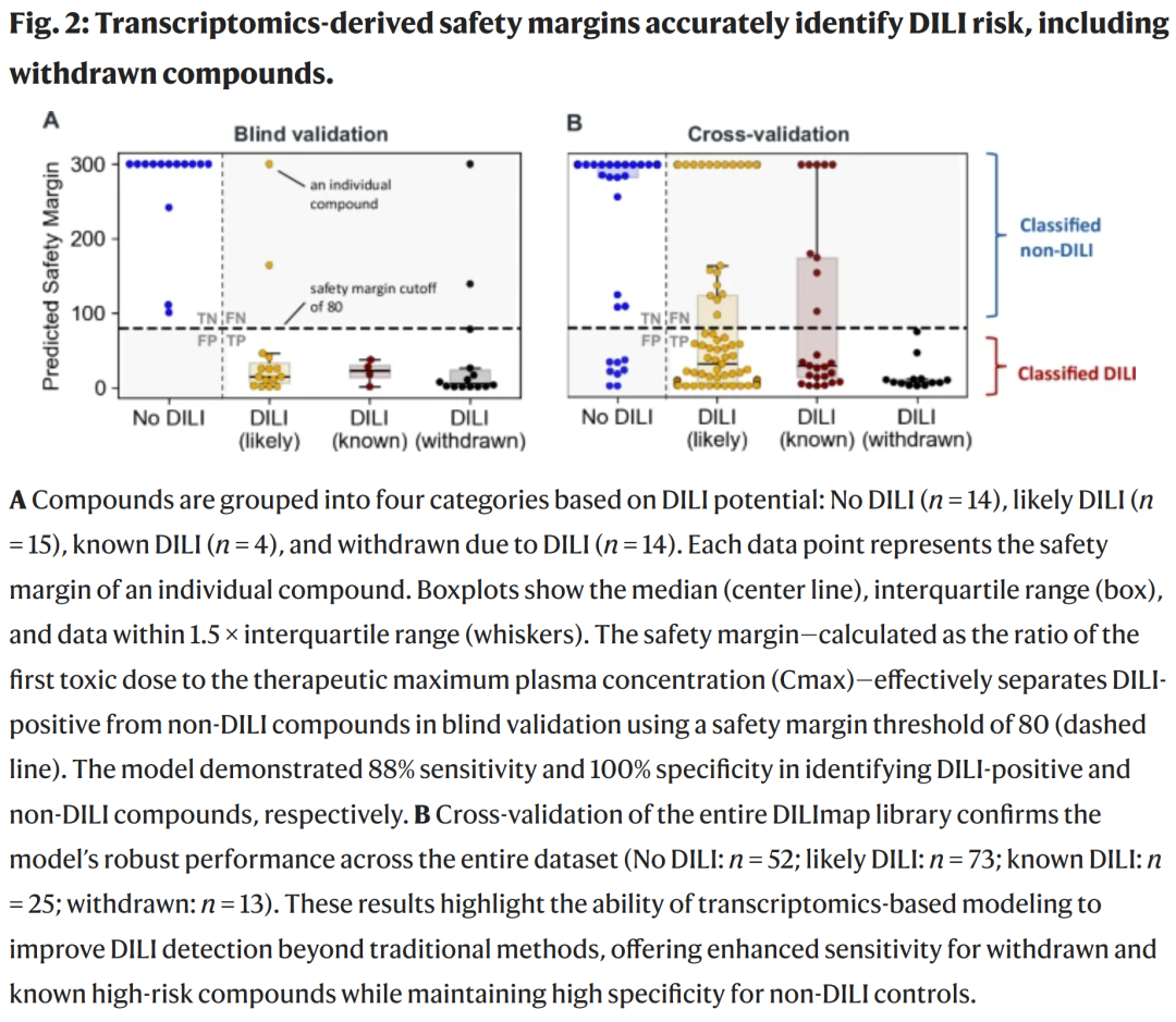 DILImap 数据库包含 300 种化合物、多个浓度梯度,在确保细胞活性和 RNA 质量的前提下生成差异表达与通路富集特征。利用这些多维路径特征输入机器学习模型(最终选择随机森林),得到剂量分辨的 DILI 概率,并结合临床 Cmax 建立安全边界(Margin of Safety,MOS),用于风险分类与机制解析。