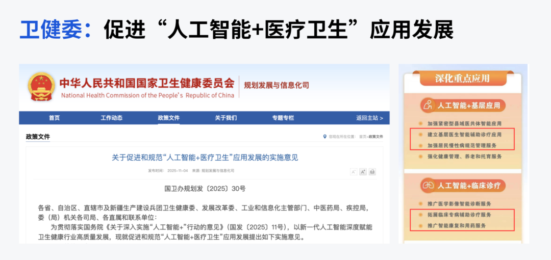 政策明确方向:国家已将「AI+基层医疗」列为重点任务,既要求提升基层医生的诊疗能力,也强调对居民慢病的规范化管理。