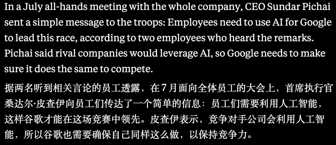 一个月后,谷歌CEO桑达尔·皮查伊也在全员大会上要求员工积极运用AI,以确保谷歌在AI竞赛中保持领先。