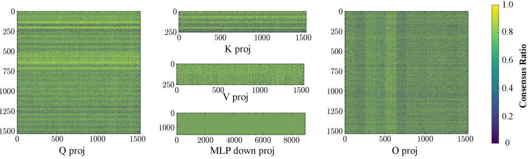 如下所示,在五次RLVR运行中,团队绘制了第13层的投影(Q/K/V/O)以及MLP的下投影。