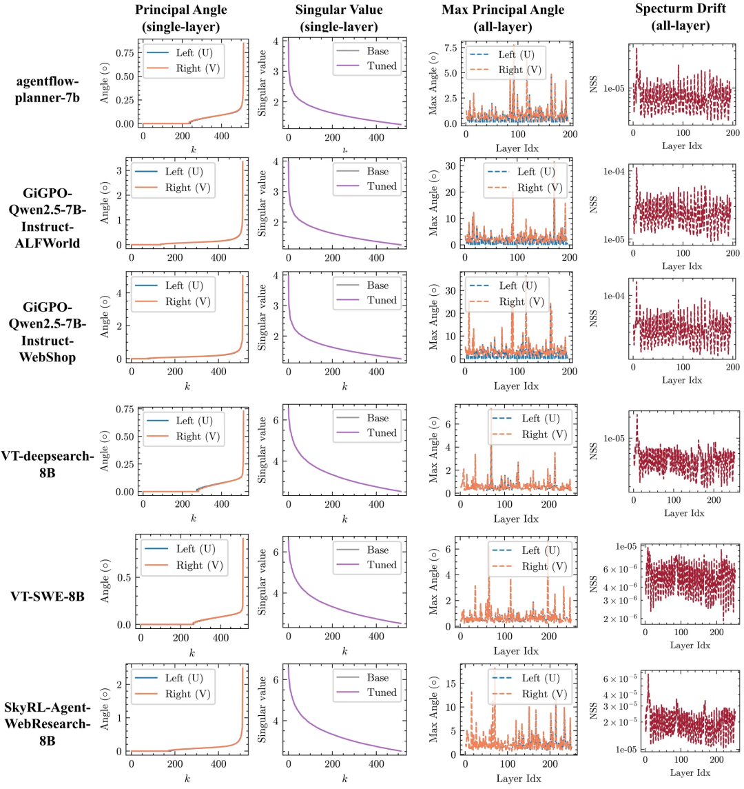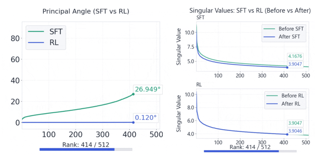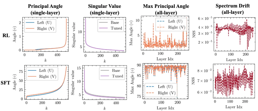 如下所示,是SFT与RLVR在Qwen3-8B-Base上的谱几何对比。