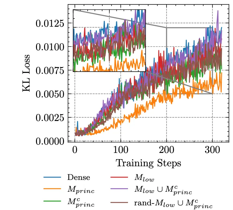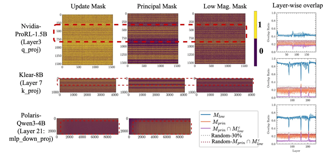 研究人员将RL的更新掩码与主权重掩码M_princ、低幅值掩码M_low,以及二者的组合M_princ ∩ M_low^c进行对比。