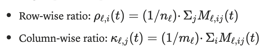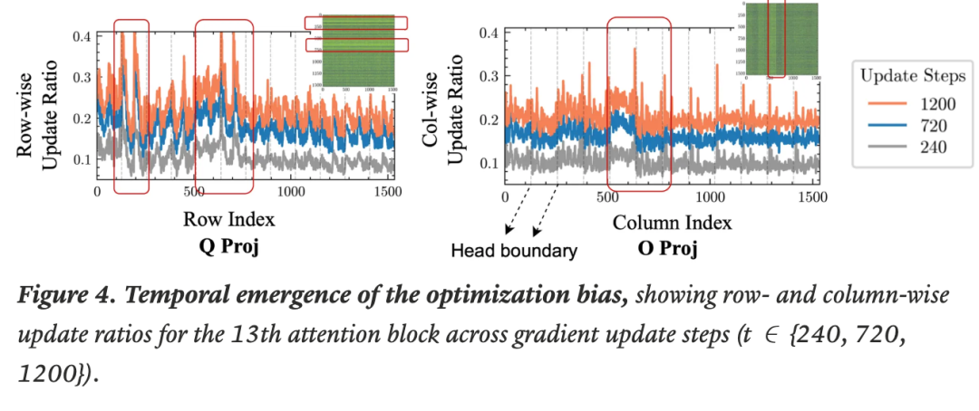 为了研究单次运行内部的动态变化,作者又在DeepSeek-R1-Distill-Qwen-1.5上,跟踪了训练步骤中的按行和按列的更新比率: