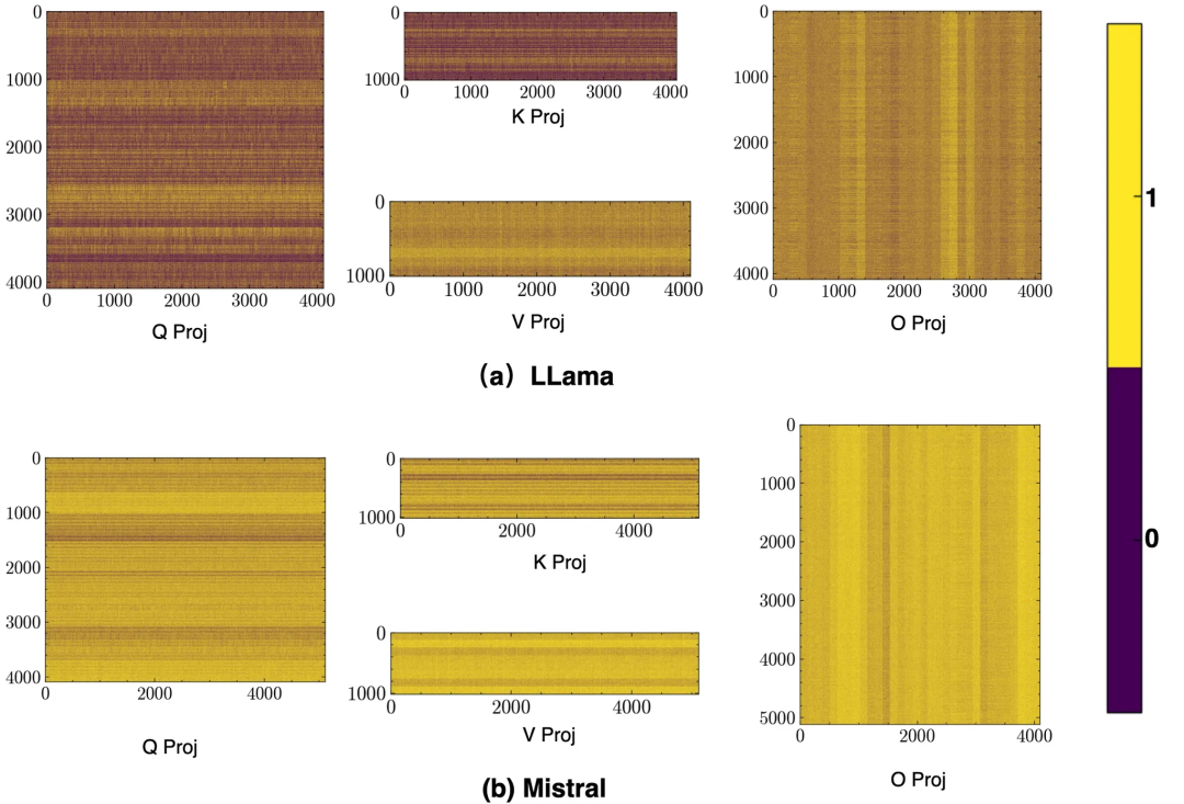 不仅如此,作者又在Llama和Mistral上,同样观察到了类似的条纹结构特征。