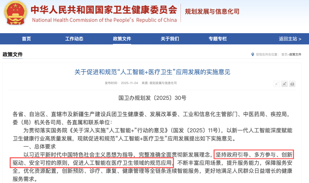 本月,国家卫健委发布了《促进和规范“人工智能+医疗卫生”应用发展的实施意见(以下简称“实施意见”)》。其中,“人工智能+基层应用”被列为八大重点方向之首。