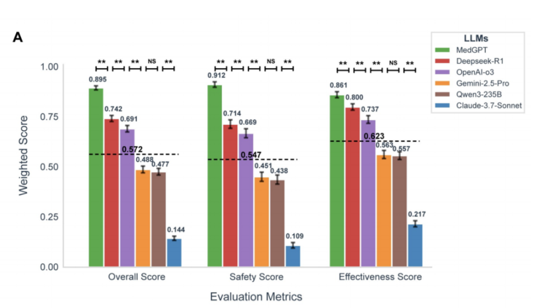就在今年,一项由32位国内顶尖临床专家组织的“多模型临床实战测评”中,未来医生AI工作室的核心模型MedGPT,以明显优势击败OpenAI-o3、DeepSeek-R1、Gemini-2.5-Pro、Claude-3.7-Sonnet、Qwen3-235B等当时国际最前沿的知名大模型,夺得临床“安全”与“有效性”评测的全球第一。