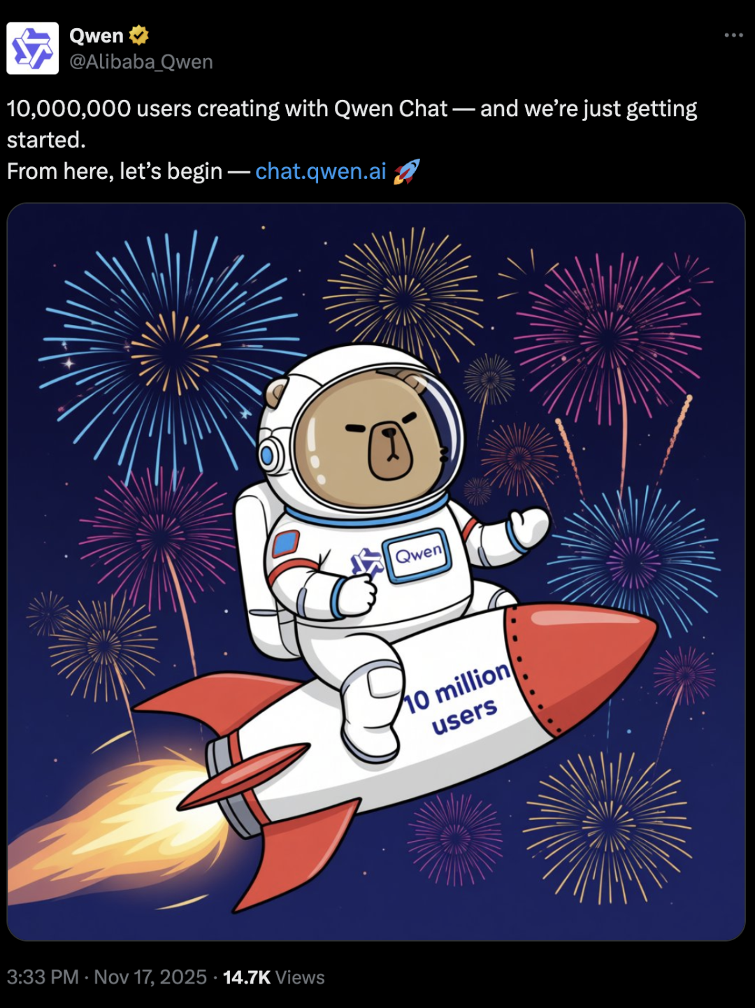 刚刚,Qwen宣布有1千万用户和Qwen Chat对过话: