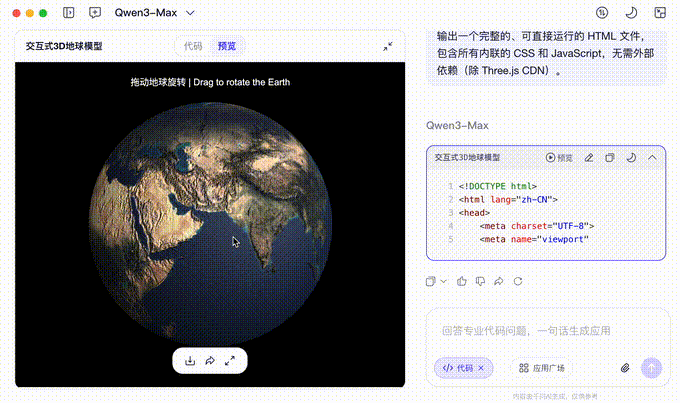 千问生成的这个地球不仅效果逼真,还可以用鼠标随意拖动。