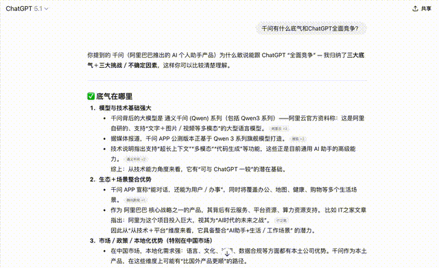 面对相同的问题,GPT-5.1查询互联网信息后,表示千问有三大底气: