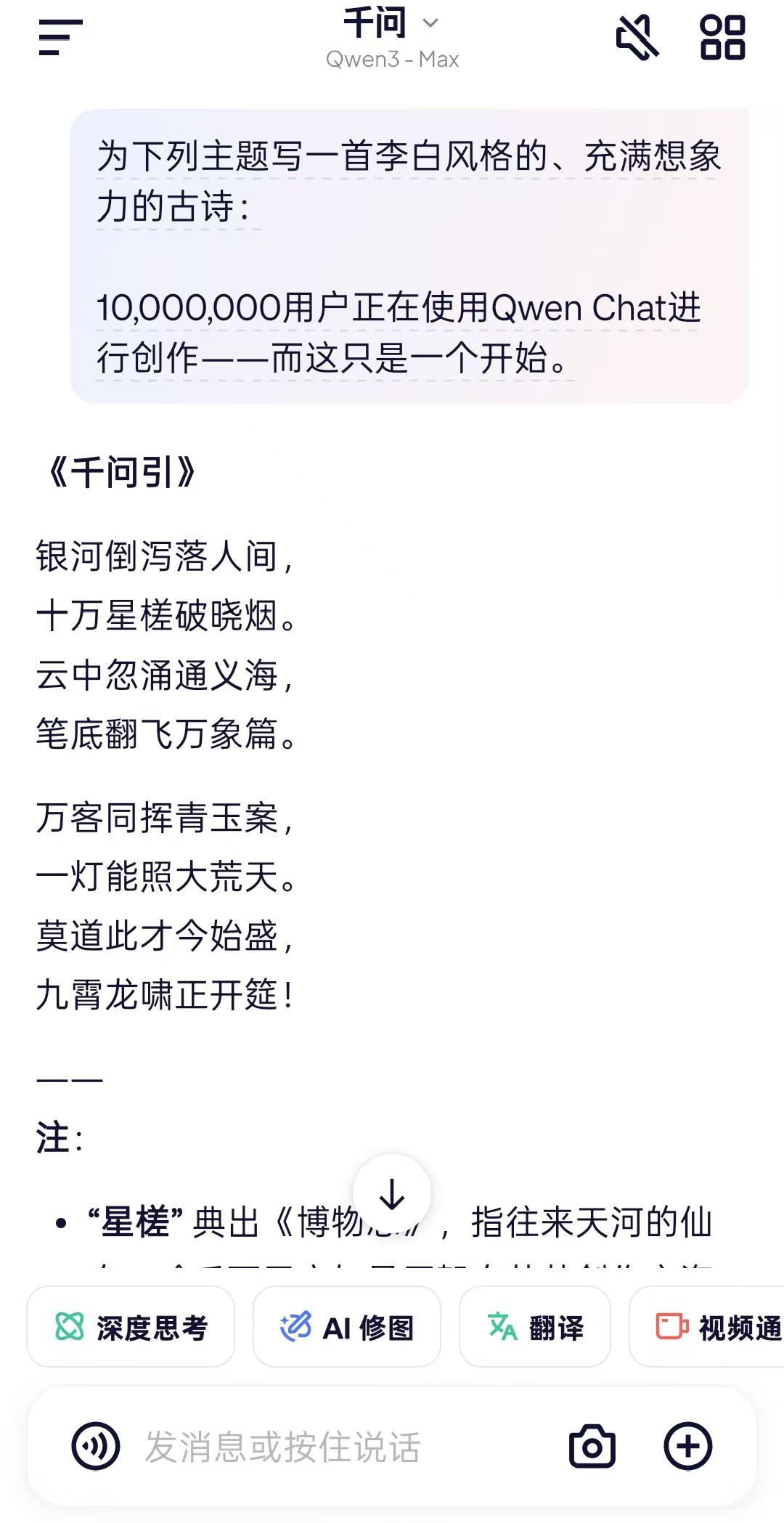 为下列主题写一首李白风格的、充满想象力的古诗: 1000,0000用户正在使用Qwen Chat进行创作——而这只是一个开始。