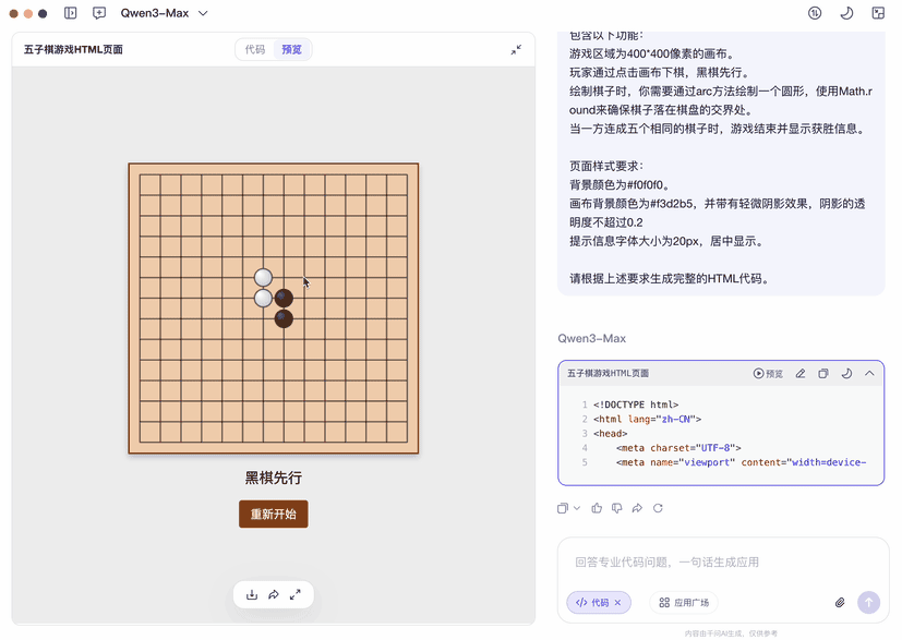 我们直接让千问生成一个难点的——五子棋,看它能完成的怎么样。