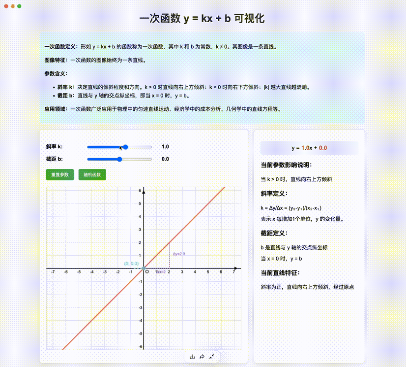 比如,下边这个「一次函数可视化」应用,通过调节k和b,一眼就能看出对函数图像的改变。