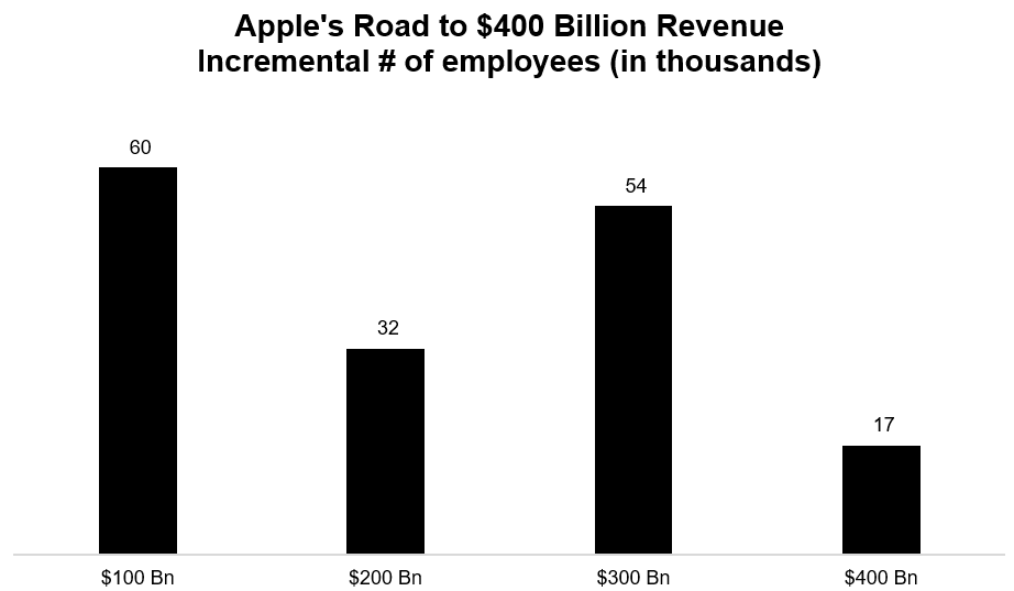 最近一次千亿营收增长,苹果仅增加了约1.7万名员工。