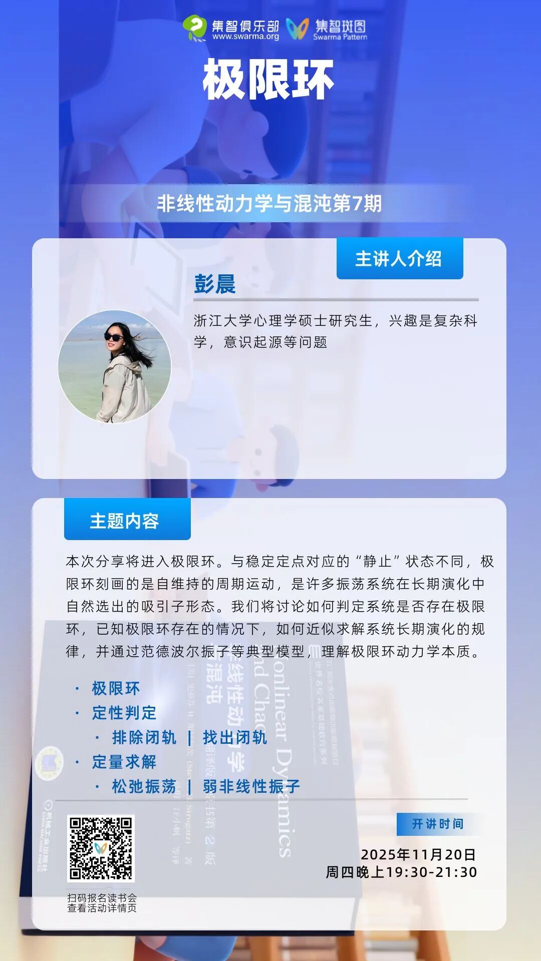 扫码参与「非线性动力学与混沌」读书会,加入社群,获取系列读书会永久回看权限,与社区的一线科研工作者沟通交流,共同溯源复杂科学的思想脉络。