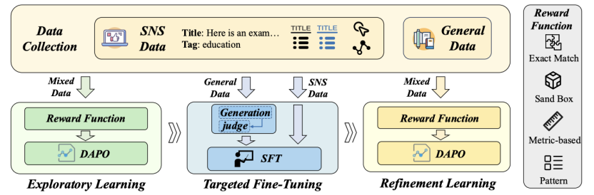 模型在此过程中,会基于已校正的能力基础进一步探索复杂任务间的权衡策略,深化其与平台安全、用户体验等高级目标的对齐,最终得到一个行为更稳定、泛化能力更强且与SNS场景高度适配的模型。