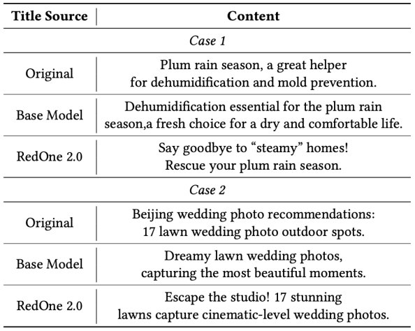 例如在关于除湿器的案例1中,不同于基线模型改写标题的平实通用,RedOne 2.0通过使用「水汽弥漫」等生动描述,显著增强了情感共鸣。