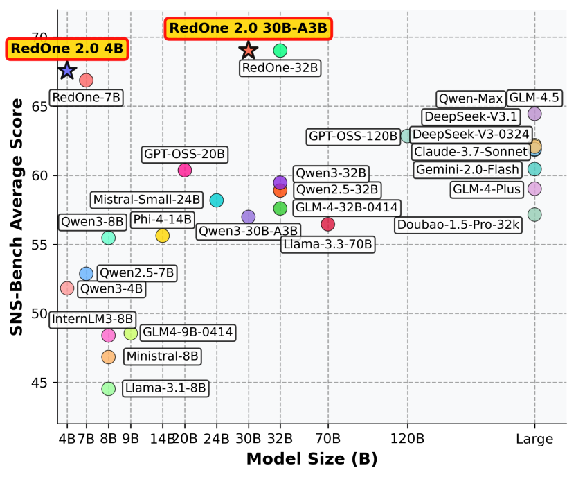 其中,RedOne 2.0-4B模型在SNS-Bench上远远领先于同量级开源模型,并在General-Bench也有小幅提升,同时也超越前代7B模型;