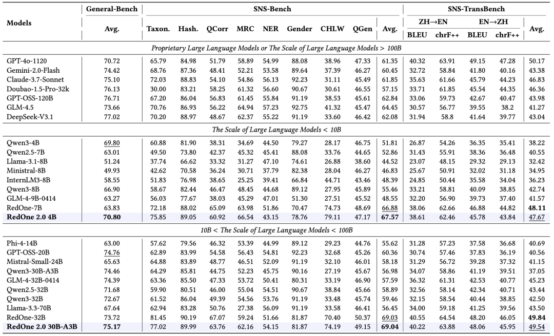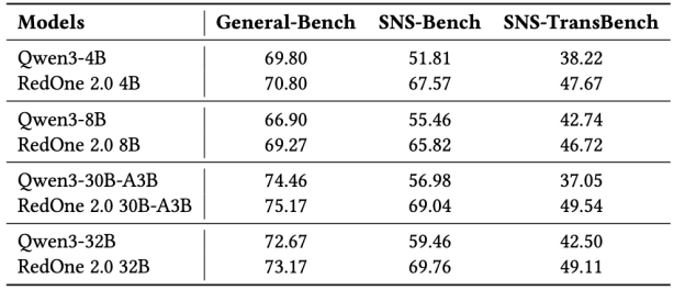 在涵盖知识推理、数学推理、代码生成、机器翻译、指令跟随、幻觉检测等通用能力的Geneal Bench,内容理解、信息检索、情感和意图分析、个性化推荐的SNS-Bench,以及专业领域翻译的SNS-TransBench上,RedOne 2.0系列以较小参数展示出更好性能。