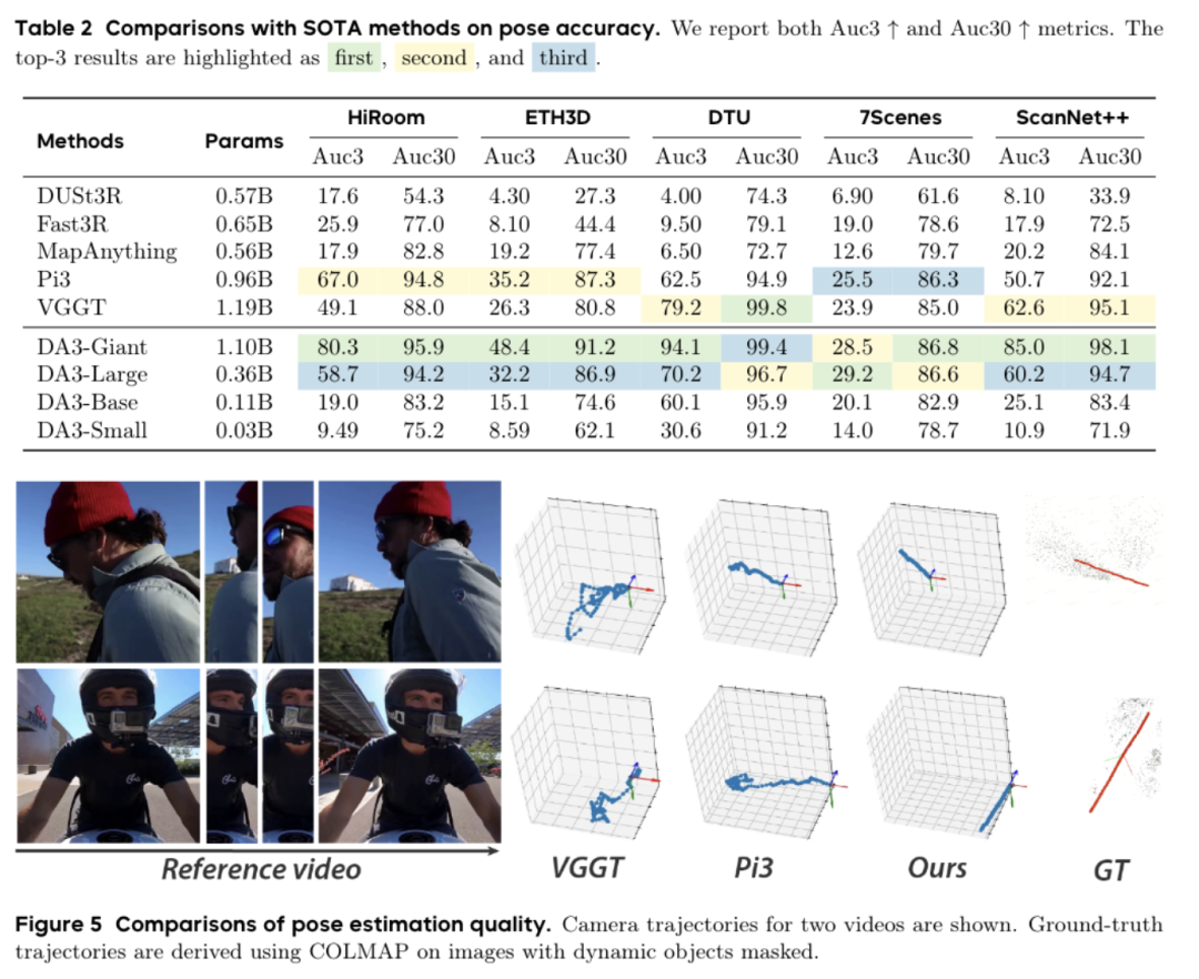 评测结果就是DA3全程能打。给一段视频,它能精准估计每帧的相机内参与外参,还原每帧相机的运动轨迹;