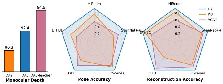 而且,它在团队全新打造的视觉几何基准上横扫所有任务,相机定位精度平均提升35.7%,几何重建准确率涨了23.6%,单目深度估计还超越了自家前代DA2。