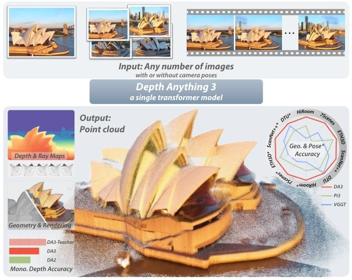 架构足够简单,核心能力却不差。能从一张图、一组多视角照片甚至一段随手拍的视频里,精准算出物体深度、还原相机位置,不仅能拼出完整3D场景,还能脑补出没拍过的新视角图像。