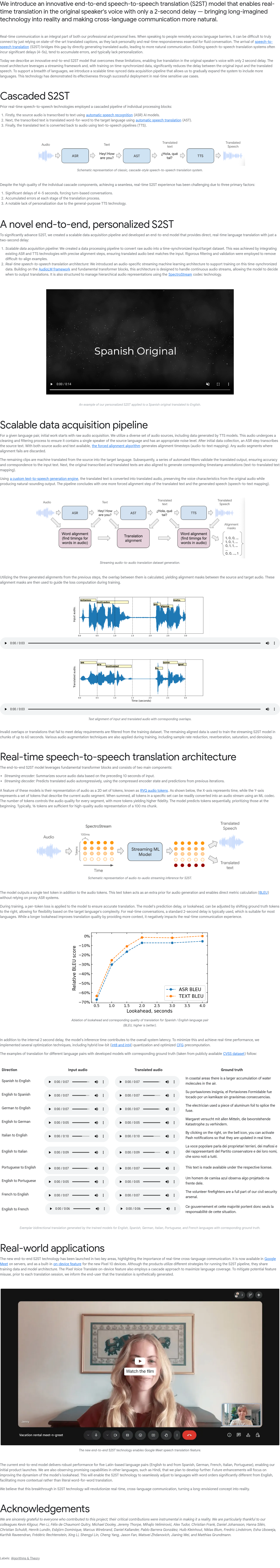 本文介绍了一种创新的端到端语音到语音翻译(S2ST)模型,实现仅2秒延迟的实时翻译,并保留原说话者声音。该技术突破了传统系统延迟高(4–5秒)、误差累积和缺乏个性化的问题,使跨语言交流更自然流畅。现有翻译多依赖字幕,缺乏情感与即时互动,而S2ST直接生成目标语言语音,提升沟通质量。新模型通过端到端架构优化响应速度与翻译准确性,支持实时对话场景,增强远程交流的沉浸感与亲和力。该方案推动语音翻译迈向实用化,适用于多语言会议、国际通话等场景,显著改善用户体验,是语音翻译领域的重要进展。