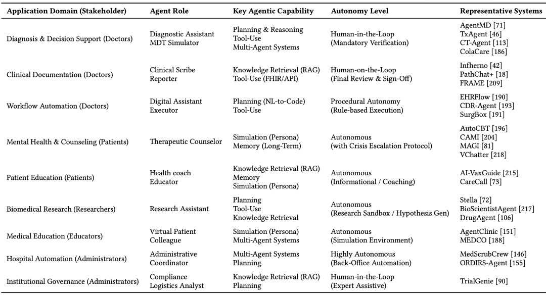 医疗智能体的应用领域、智能体角色、自主级别与代表系统概览