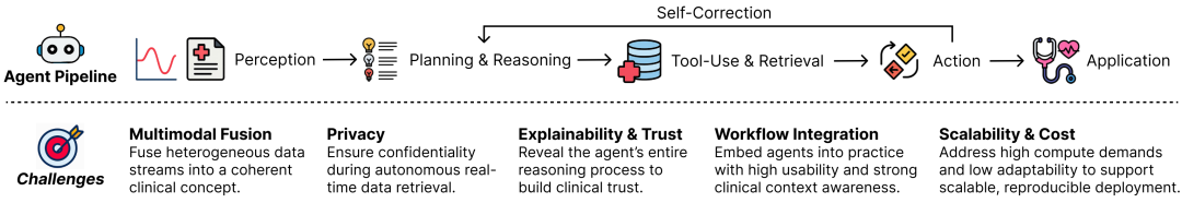 尽管前景广阔,医疗智能体在实际部署中仍面临诸多挑战:
