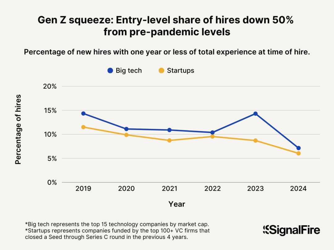 风投公司SignalFire的报告显示,自疫情前以来,大厂对应届生的招聘比例腰斩,新毕业生进入科技行业变得前所未有的艰难。