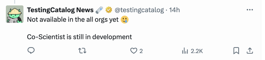 事实上,谷歌早在今年2月就发布过科研辅助类的Agent,但与这次内测的能力相比,功能规模和表现都不是一个量级。