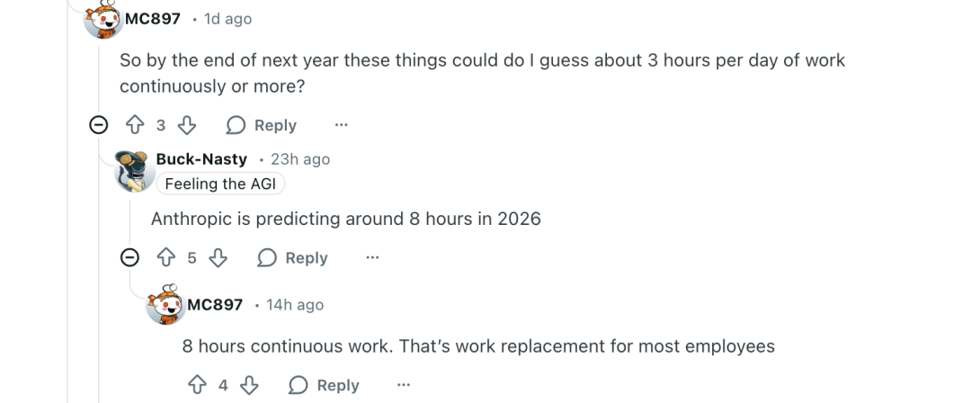 而另一位网友则回应到:Anthropic给的时间线是2026年连续工作8小时。