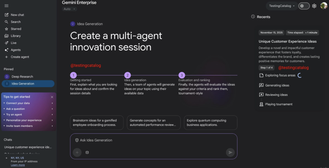 具体来看,Gemini for Enterprise的多智能体系统会首先接收主题与评估标准,大规模生成初始创意(100+)。