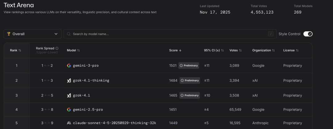用户投票的大模型竞技场也是一样,马斯克的Grok4.1昨天才刷完榜,今天就被反超了。