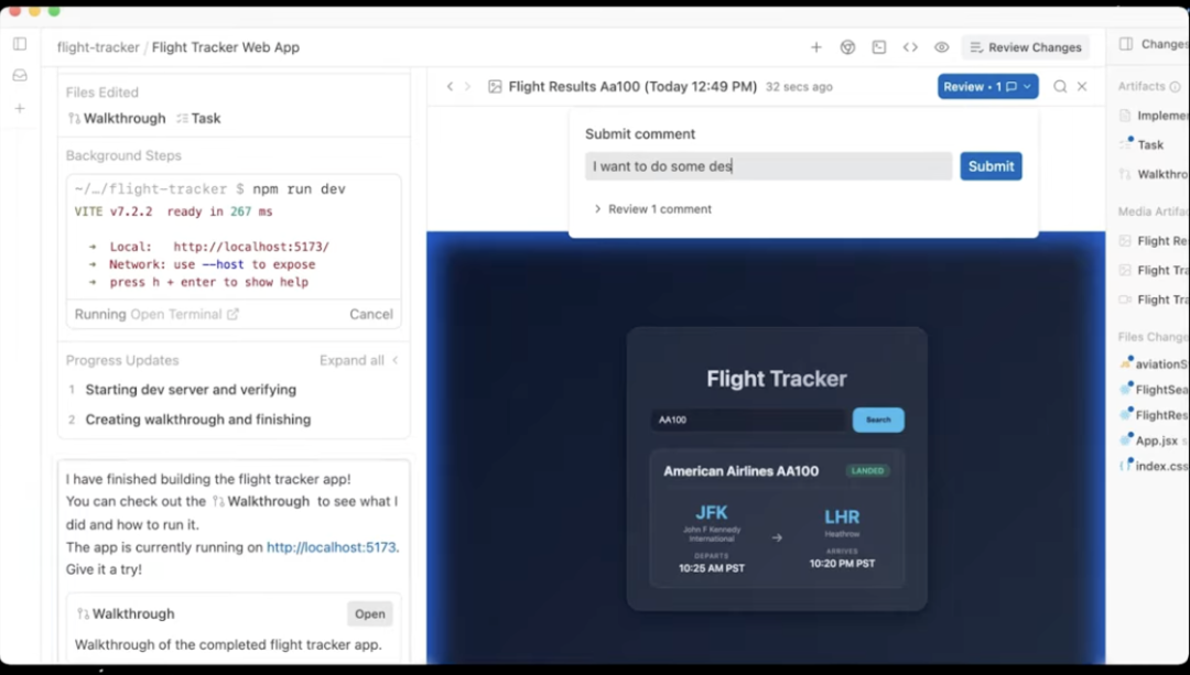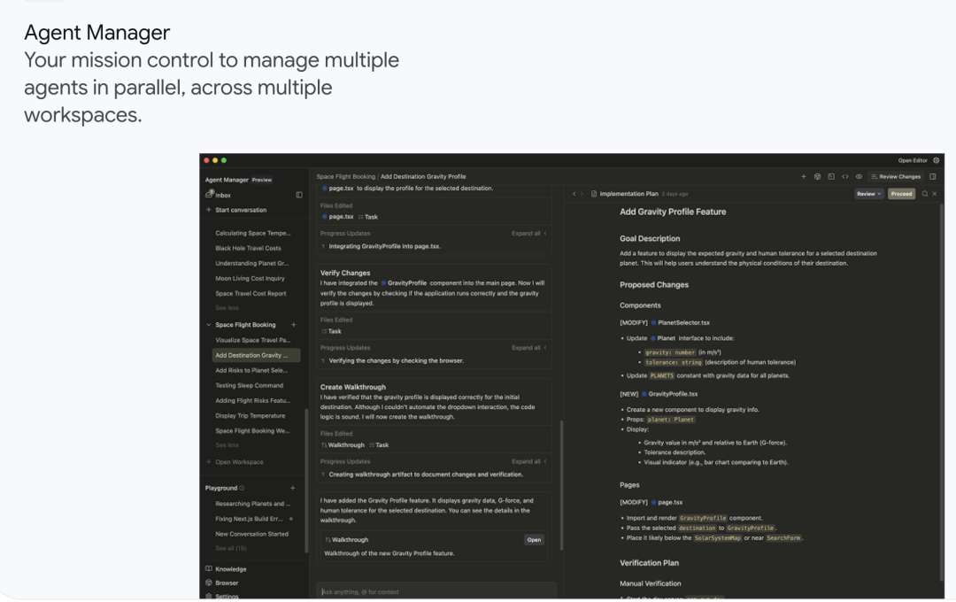 与Cursor为代表的AI IDE相比,Google Antigravity的智能体已被提升到一个独立的界面,并可直接访问编辑器、终端和浏览器。智能体可以代表用户自主规划和执行复杂的端到端软件任务,同时验证自身的代码。