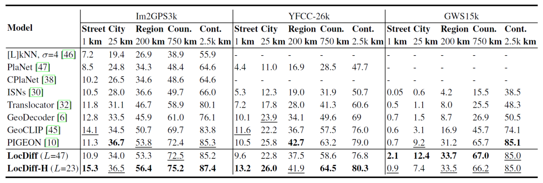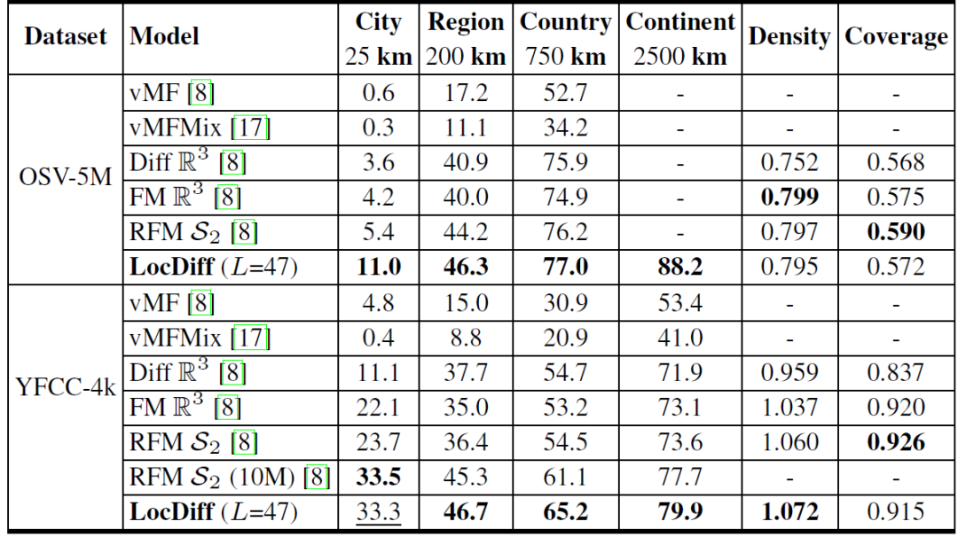 如下表所示,在与同类生成式模型的对比中,LocDiff 在 OSM-5M 和 YFCC-4k 数据集上均优于 DiffR³、FMR³ 等对比模型,验证了多尺度潜扩散方法的优势。